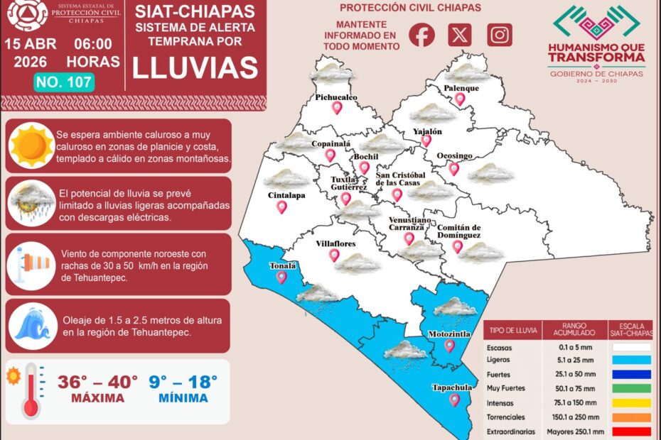 Hoy, 15 de abril del 2026, el Sistema de Alerta Temprana por #Lluvias (#SIAT) de #ProtecciónCivil Chiapas emite el pronóstico de lluvias en nuestro estado.… Read More »Pronostican lluvias ligeras en tres regiones de Chiapas
