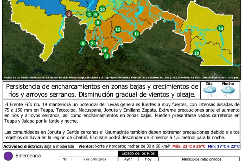 Protección Civil del estado de Tabasco, informa que el Frente Frío no. 19 mantendrá un potencial de lluvias generales fuertes a muy fuertes, con intensas… Read More »Frente Frío 19 provoca lluvias intensas y vientos fuertes en Tabasco; autoridades piden extremar precauciones