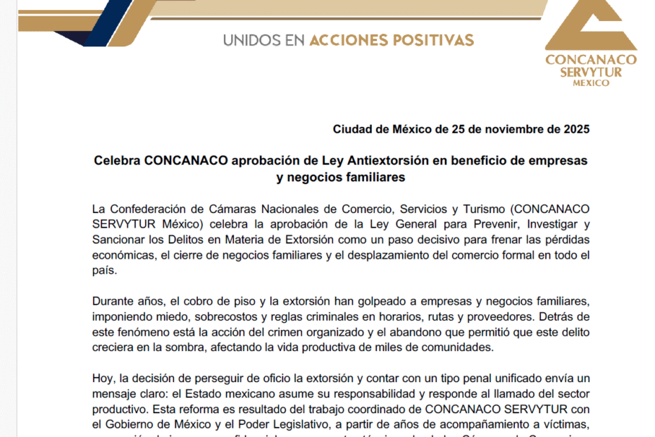 La Confederación de Cámaras Nacionales de Comercio, Servicios y Turismo (CONCANACO SERVYTUR México) celebra la aprobación de la Ley General para Prevenir, Investigar y Sancionar… Read More »Celebra CONCANACO aprobación de Ley Antiextorsión