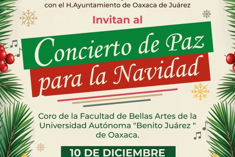 Este miércoles 10 de diciembre, a las 18:00 horas, el Zócalo de la ciudad de Oaxaca se convertirá en el punto de encuentro para celebrar… Read More »Concierto de Paz para la Navidad reunirá a familias oaxaqueñas en el Zócalo este 10 de diciembre