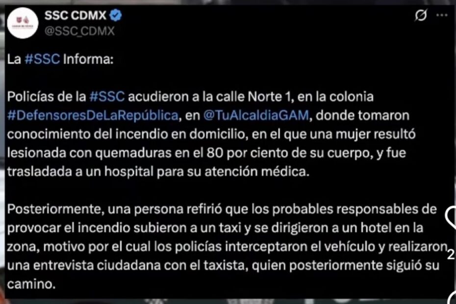 Una agresión atroz sacudió la colonia Defensores de la Ciudad de México, donde una mujer de 30 años fue víctima de un ataque con gasolina… Read More »EN LA COLONIA DEFENSORES DE LA CDMX, SE REGISTRÓ UN ATAQUE FATAL HACIA UNA MUJER QUE SUFRIÓ GRAVES QUEMADURAS EN EL 95% DE SU CUERPO TRAS SER ROCIADA CON GASOLINA DENTRO DE SU CASA; BOMBEROS Y PERSONAL DE LA SSC SOFOCARON EL INCENDIO