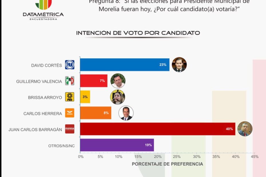 De acuerdo con el estudio, ante la pregunta directa de intención de voto, Barragán obtiene 40% de preferencia, colocándose muy por encima de sus competidores más cercanos, duplicando prácticamente al segundo lugar.